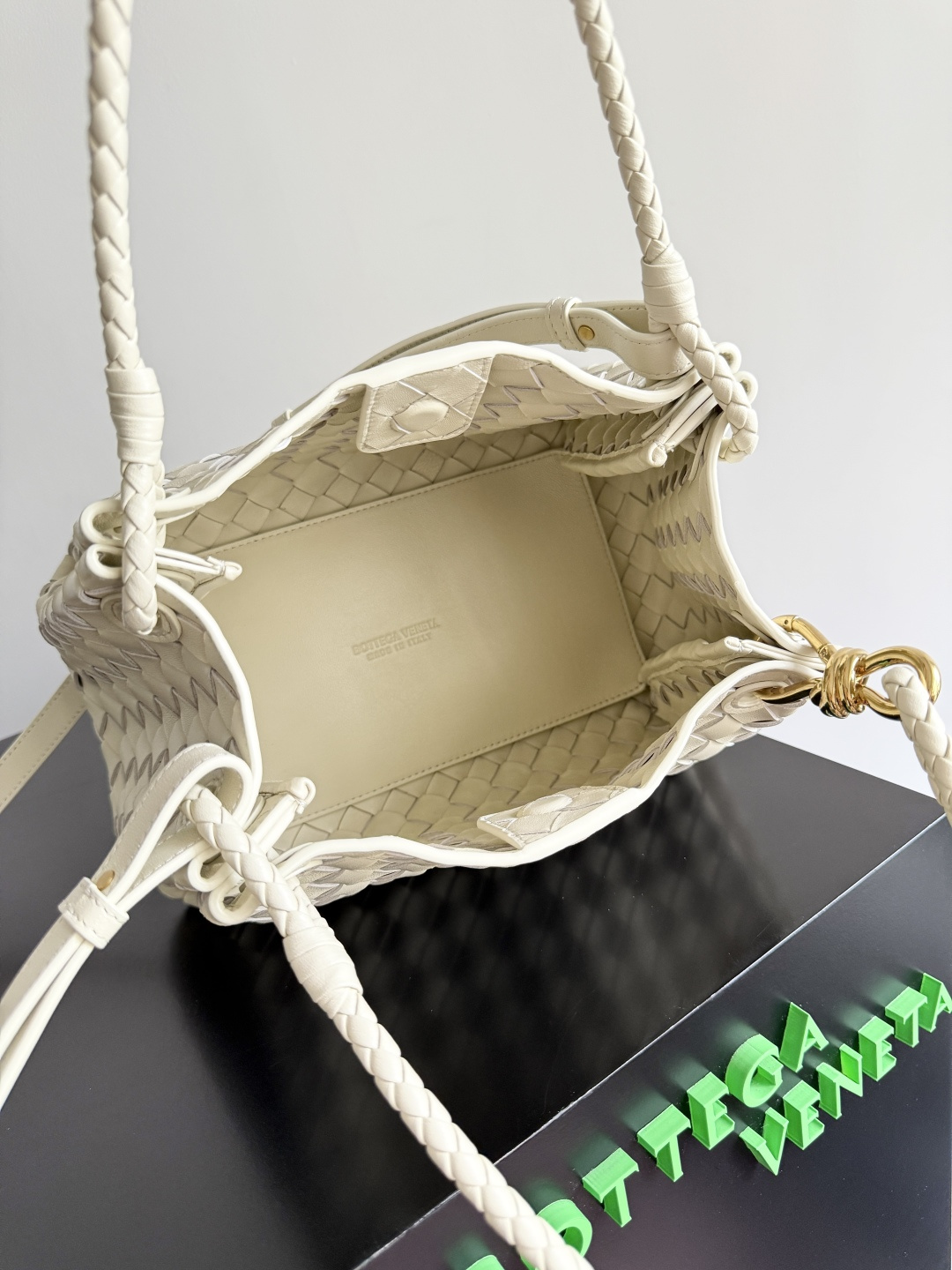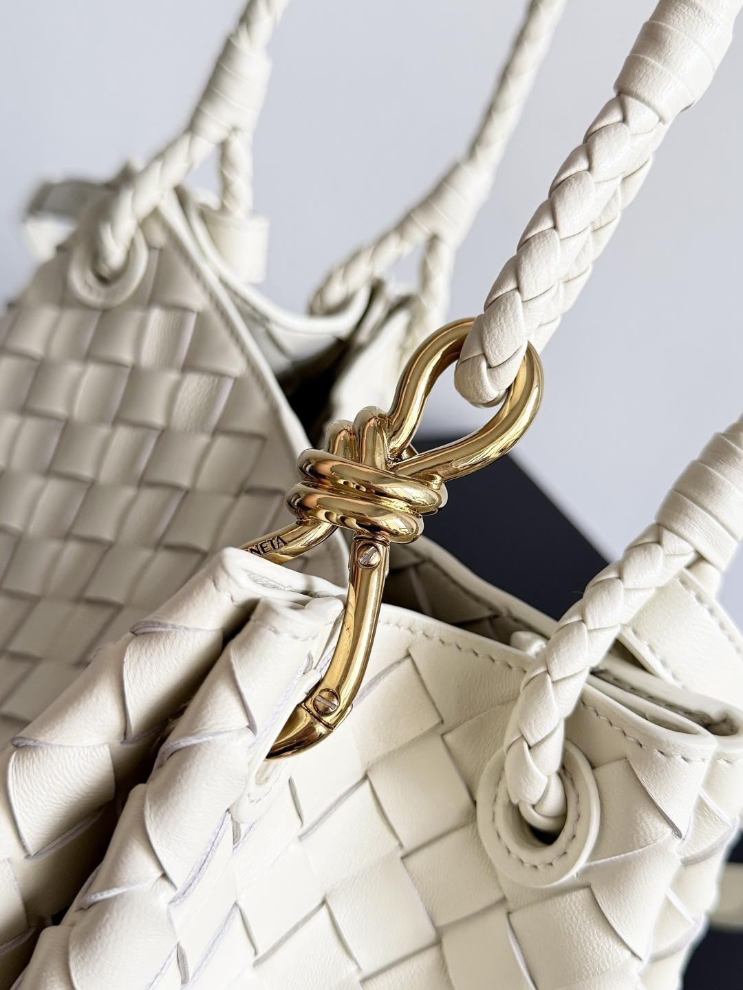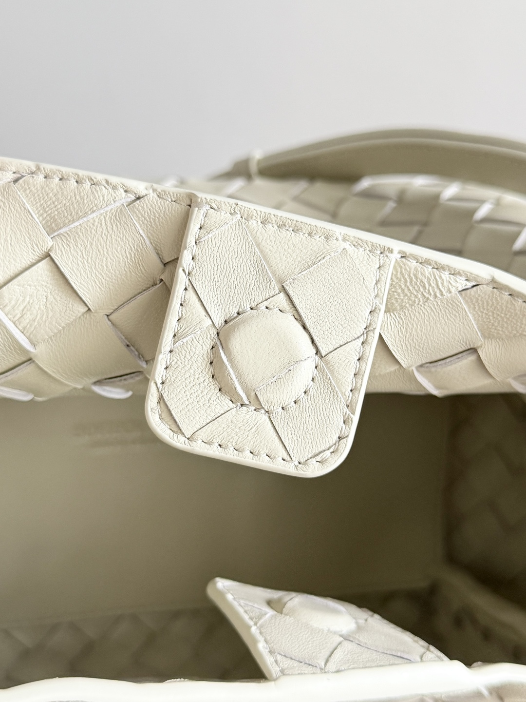 這款奶油白編織手提斜背包以 Bottega Veneta 經典編織語彙為設計靈感,透過排列均勻且層次分明的皮革編織,展現低調卻極具質感的視覺效果。象牙白色調柔和不刺眼,能自然融入各式穿搭風格,特別適合春夏季節或偏好清新極簡路線的使用者。包身線條圓潤俐落,結構穩定不易變形,搭配編織提把與可拆式斜背背帶,可依需求切換手提或斜背方式,兼顧造型完整度與實用性。金色金屬扣環在淡色皮革襯托下更顯細緻,為整體增添低調亮點。包內空間適中,可輕鬆收納手機、短夾、鑰匙與日常隨身物品,維持外型簡潔同時滿足日常使用需求。整體設計不依賴明顯標誌,而是透過色彩、比例與編織工藝展現高級感,適合重視質感與穿搭協調性的族群。