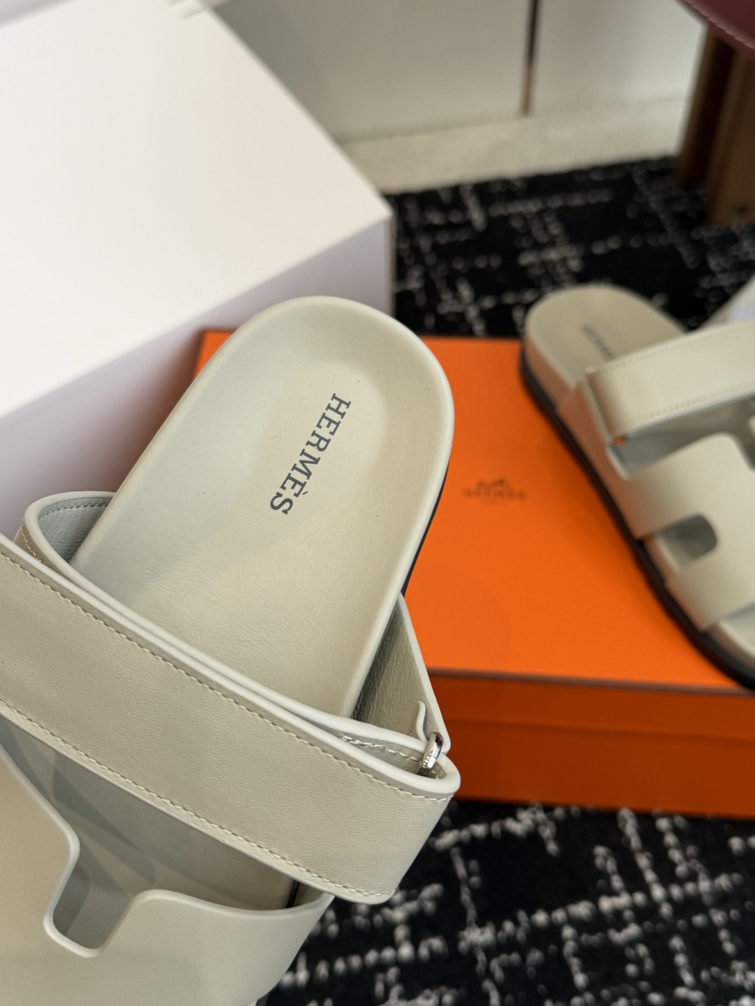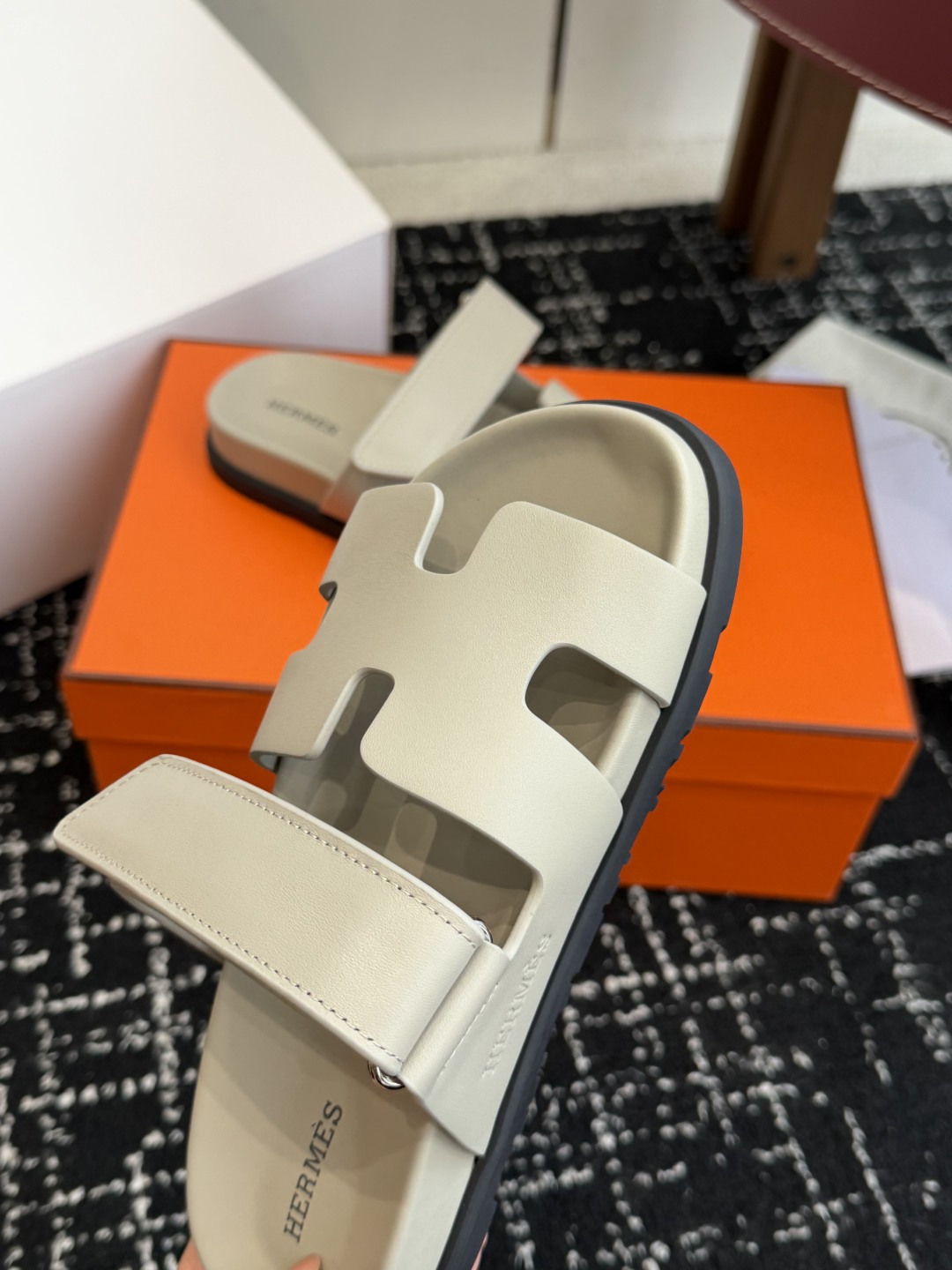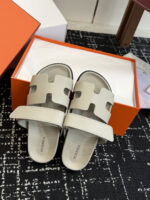 Hermes高仿莆田鞋拖鞋H字母鏤空設計灰米色牛皮質感舒適百搭時尚高級精品涼拖