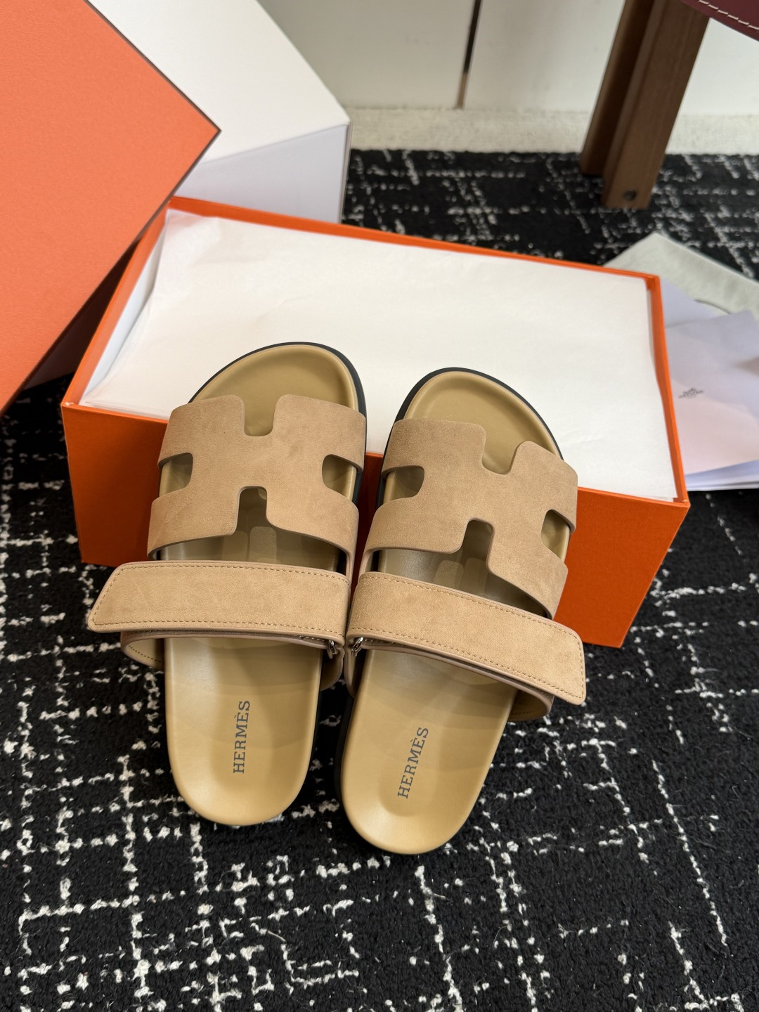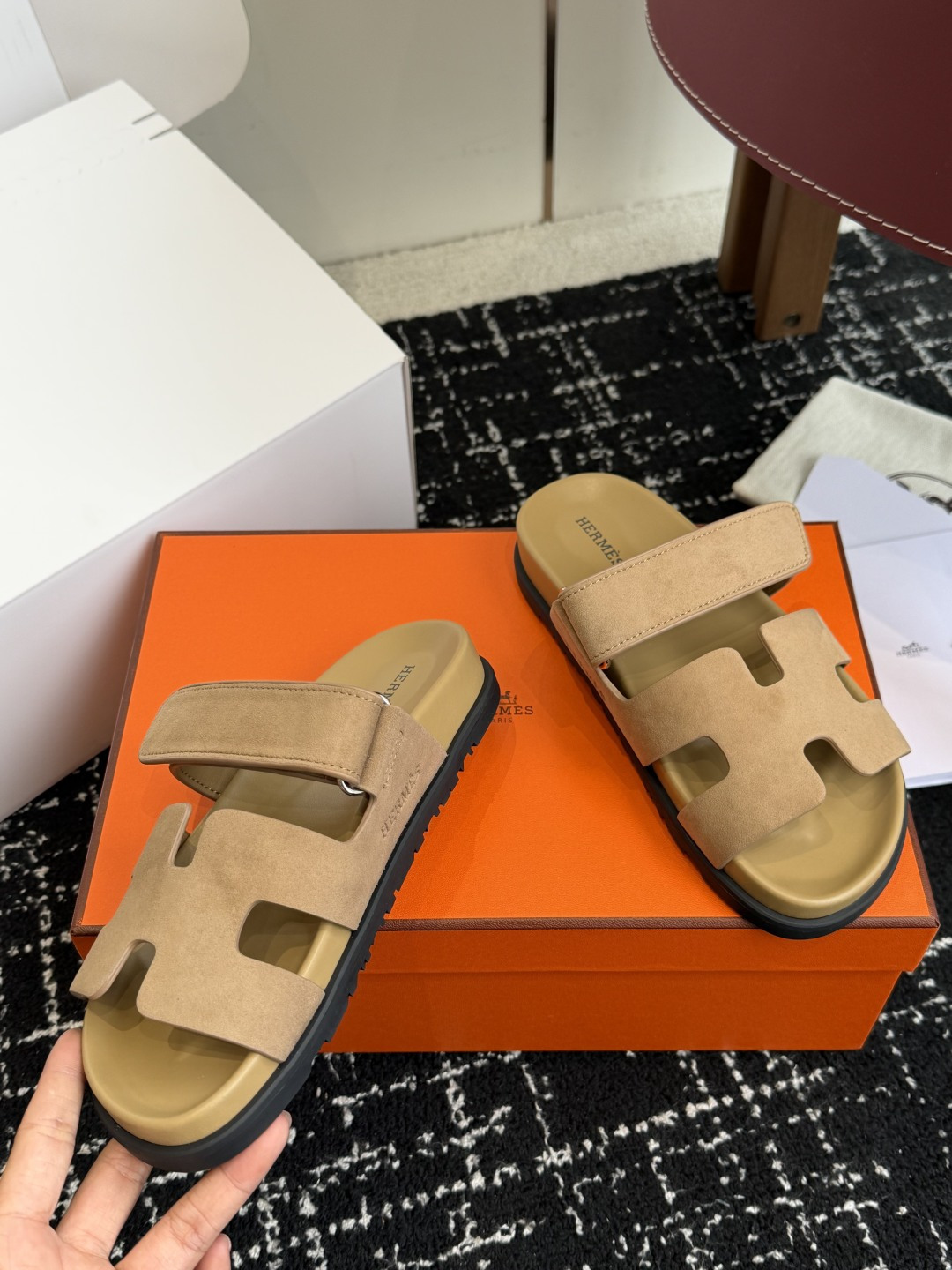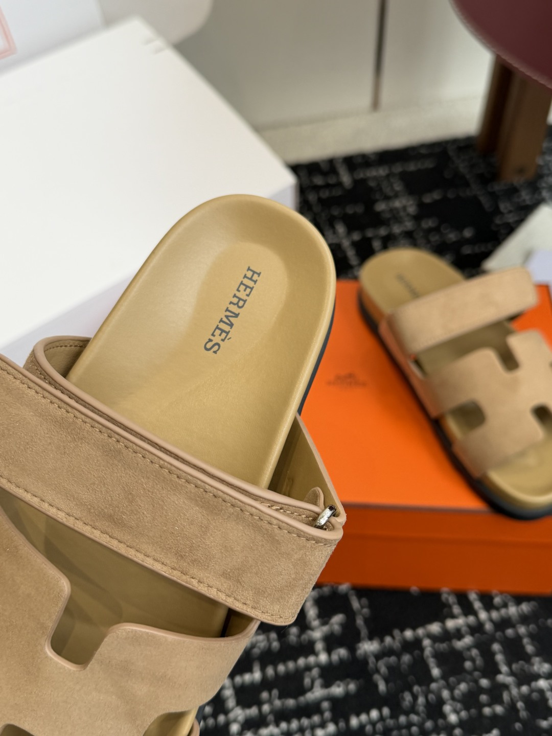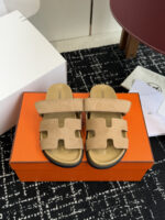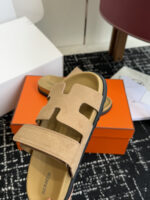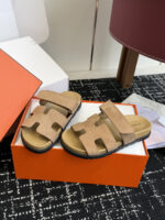 這款Hermes高仿拖鞋以經典H字母鏤空設計為核心,搭配卡其色麂皮材質,呈現出溫潤柔和且極具質感的時尚風格,整體造型簡約俐落,帶有自然高級的視覺效果,非常適合日常與度假穿搭。鞋面採用高品質麂皮打造,觸感細膩柔順,具備良好的透氣性與包覆性,長時間穿著依然舒適貼合。鞋底結構穩定防滑,行走輕盈且貼合腳型,提升整體穿著體驗與安全性。整體工藝達到精品仿製與復刻版水準,是高仿網站夏季熱銷款之一,無論搭配簡約休閒造型或輕奢風格穿搭都能輕鬆駕馭,展現自然優雅與時尚品味兼具的魅力,是夏季不可或缺的百搭精品拖鞋。