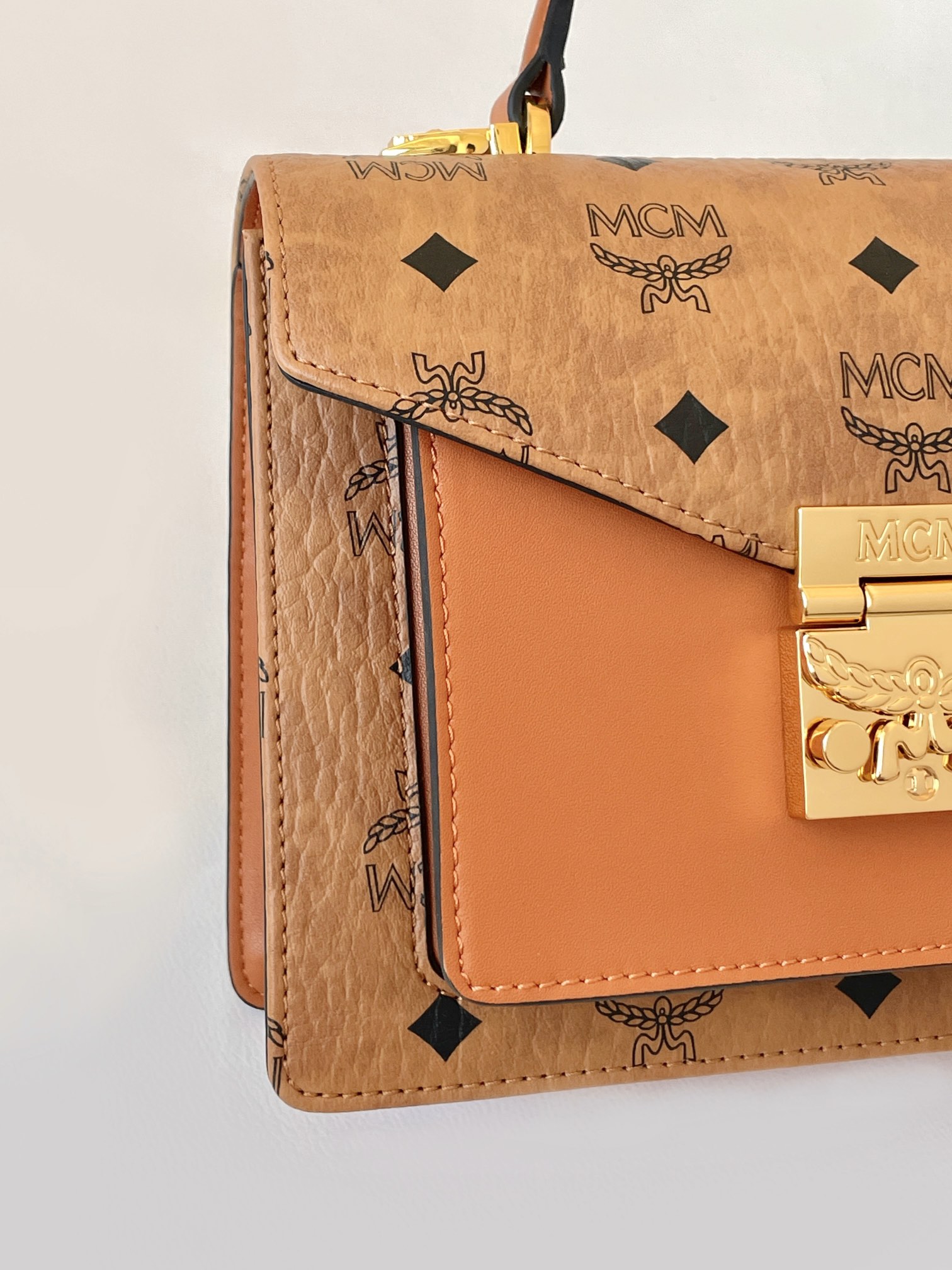 MCM Tracy 風琴包干邑色高仿精品手提斜背兩用包雕花月桂葉鎖扣設